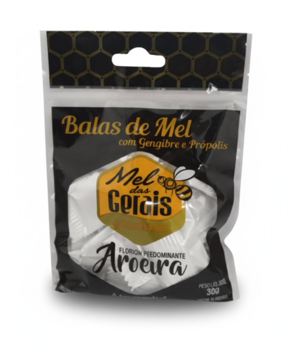 Alivie a garganta e respire melhor com as Balas de Mel com Gengibre e Própolis da Mel das Gerais! Feitas com mel puro da flora Aroeira, gengibre e própolis, essas balas combinam o sabor adocicado do mel com o toque picante do gengibre e as propriedades do própolis. São perfeitas para momentos de desconforto na garganta, oferecendo um alívio natural e agradável. Tenha sempre à mão essa pequena delícia que cuida da sua saúde e bem-estar.