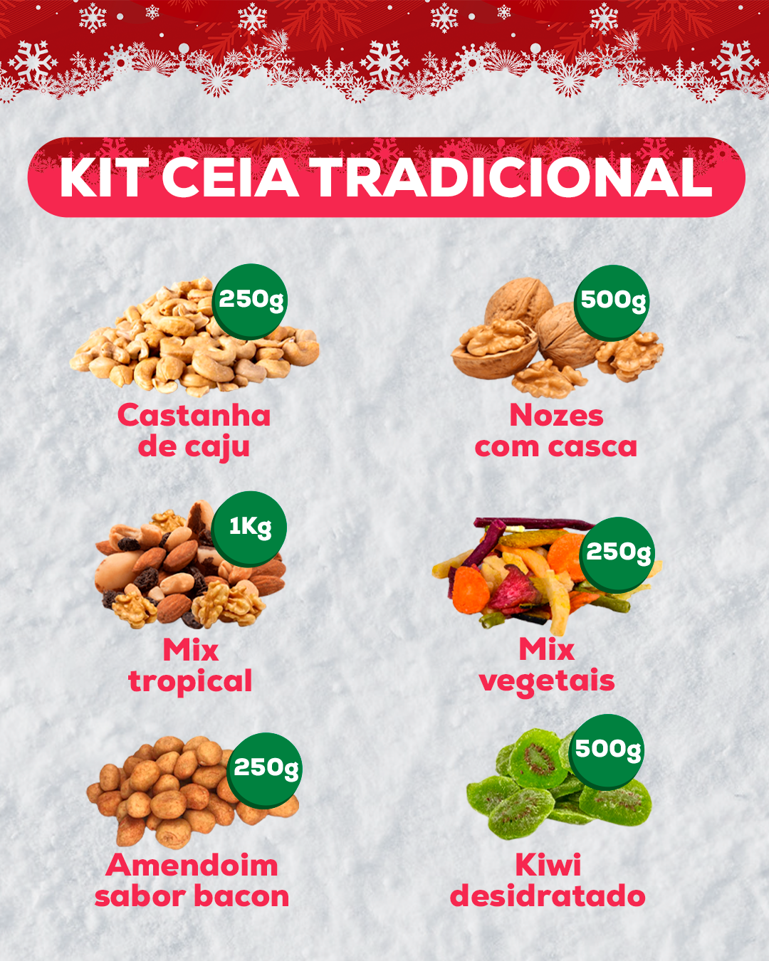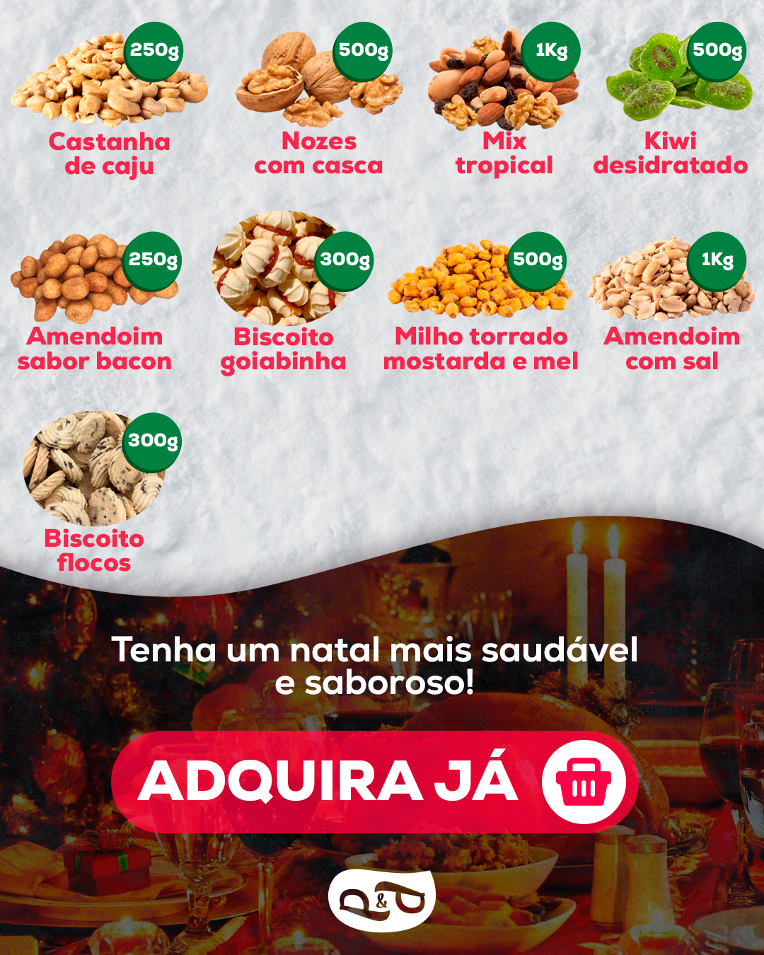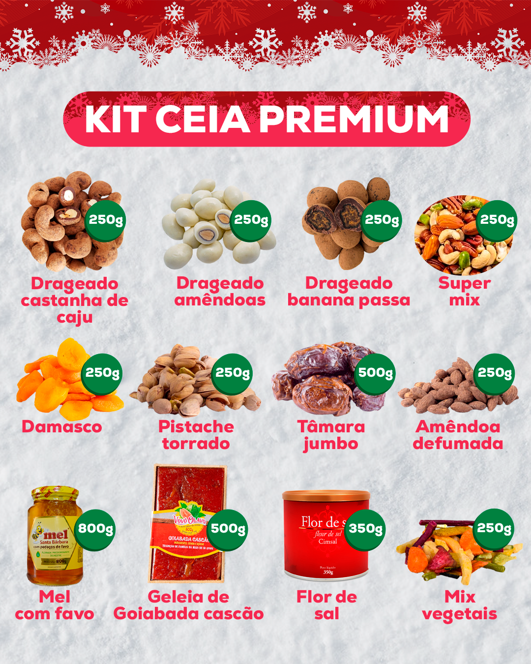 Antecipe suas compras de Natal e garanta a presença de deliciosas castanhas e oleaginosas na sua ceia! O Kit Ceia P&P é a escolha ideal para enriquecer suas comemorações de fim de ano com produtos frescos e selecionados, entregues com validade prolongada para que você possa organizar sua festa com antecedência e tranquilidade. Com opções para todos os gostos, os kits estão prontos para transformar sua ceia, seja em família, com amigos ou em qualquer reunião especial. Escolha entre as versões Premium, Gold ou Tradicional, cada uma cuidadosamente preparada para encantar e satisfazer todos os paladares.